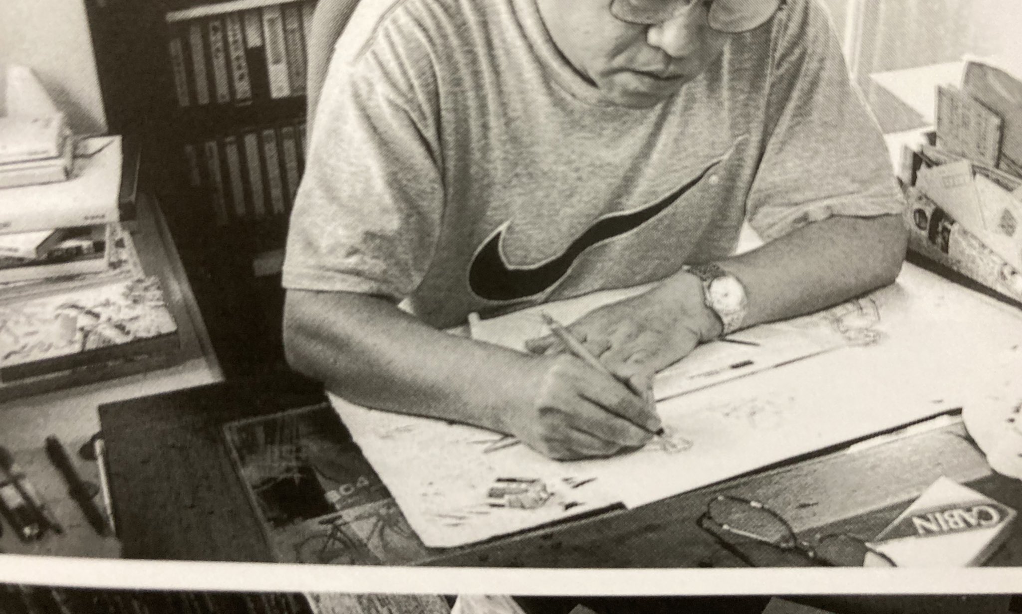唐沢なをき 漫画家の仕事場写真集に写ってた矢口先生の机 もう畳の部屋じゃなくなってますが傾斜台 はそのままかな ガラスがはまっててトレース台になってますね 小さくインク瓶を入れるくぼみも写ってる いいなあ 写真はトリミングしております